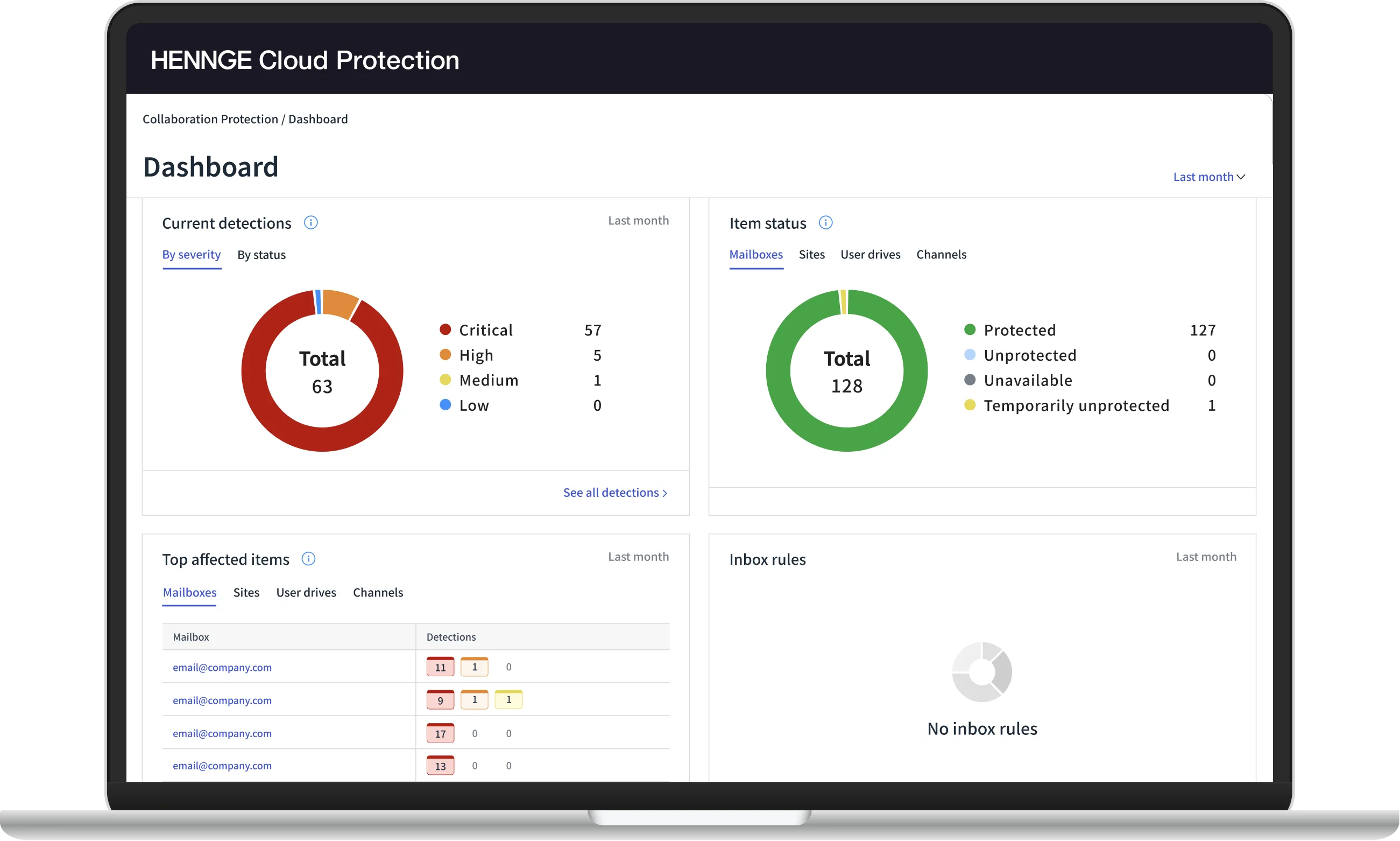 Generate daily, weekly, and monthly reports of the organization’s security posture, with protection analytics, detection insights, and system status across M365.